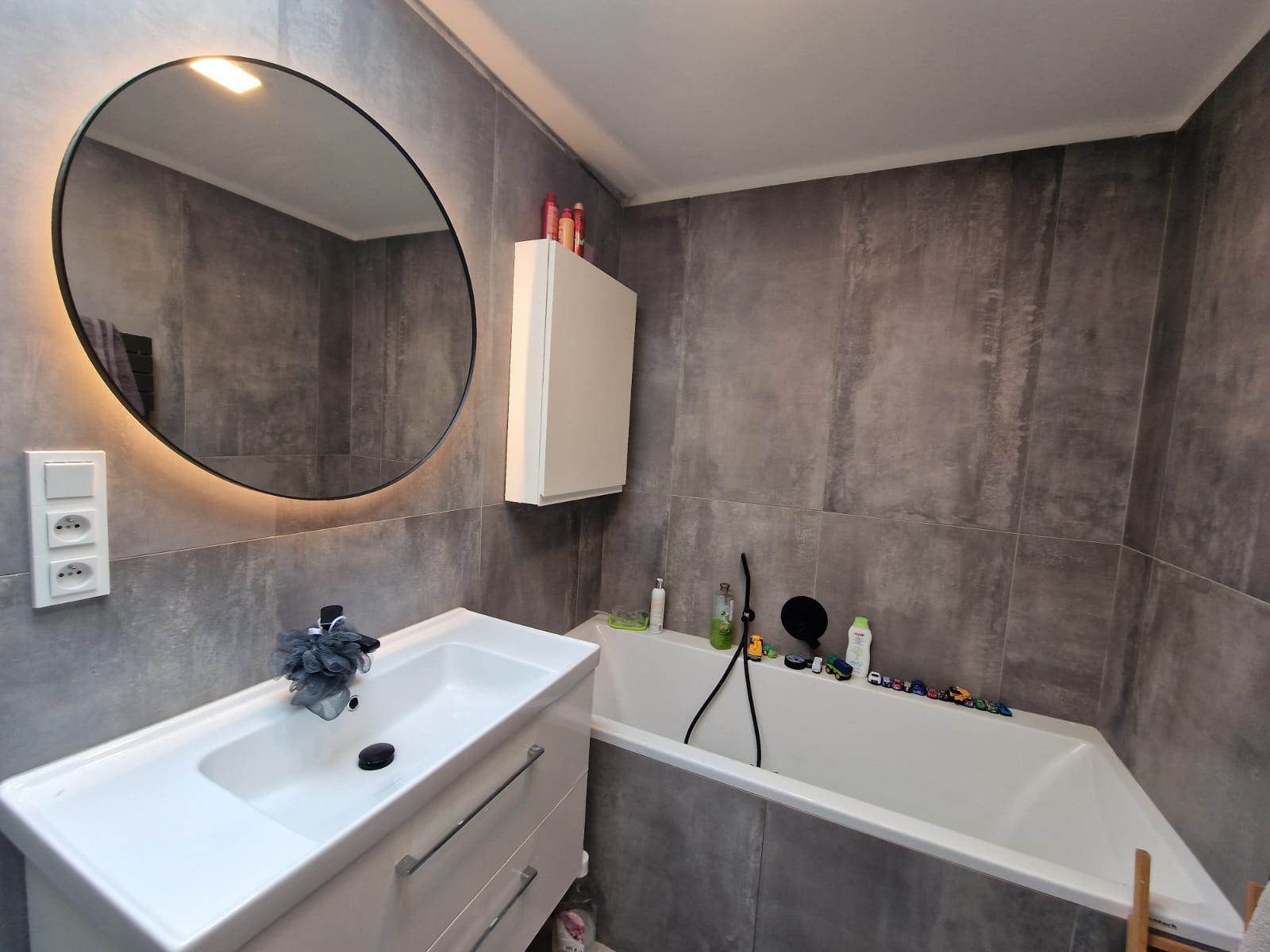 Koupelna kombinuje sprchový kout i vanu, takže si vyberete podle nálady. Čisté linie, moderní materiály a samostatné WC vytvářejí komfortní zázemí.