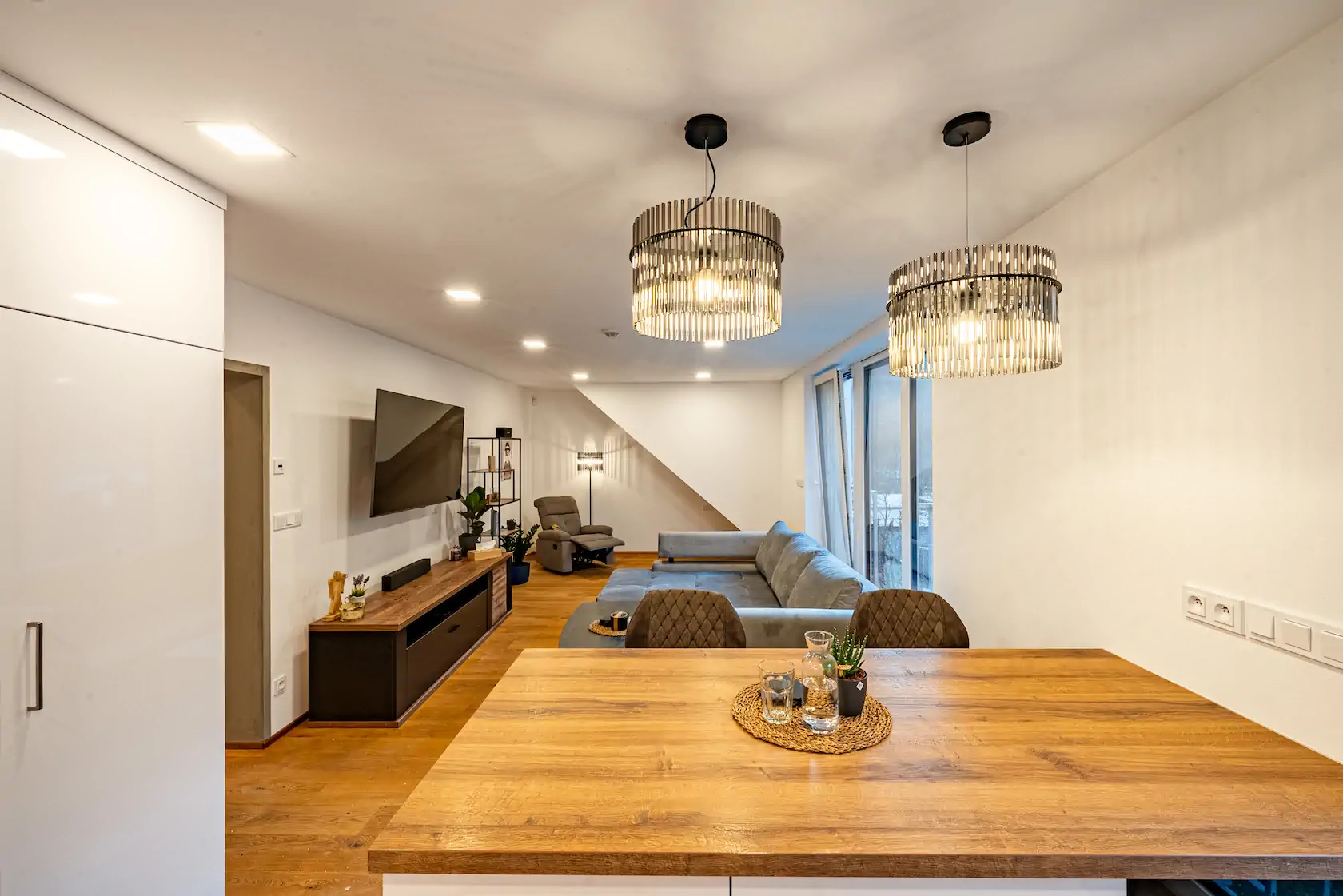 Obývací část, kuchyň i ložnice tvoří jeden harmonický celek — bez bariér, bez hluku, bez kompromisů. Místo, kde všechno působí přirozeně správně. A kde se cítíte jako doma, ještě než stihnete odložit kabát.
