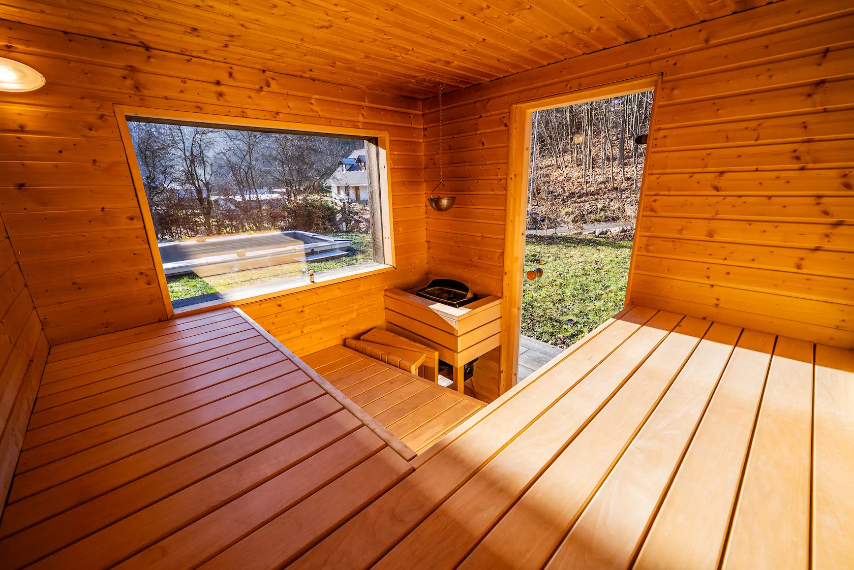 Venkovní sauna s přístupem 24/7 nabízí příjemné teplo a prostor pro skutečný relax po dni stráveném v horách. Jednoduché dřevěné provedení krásně zapadá do okolního prostředí.